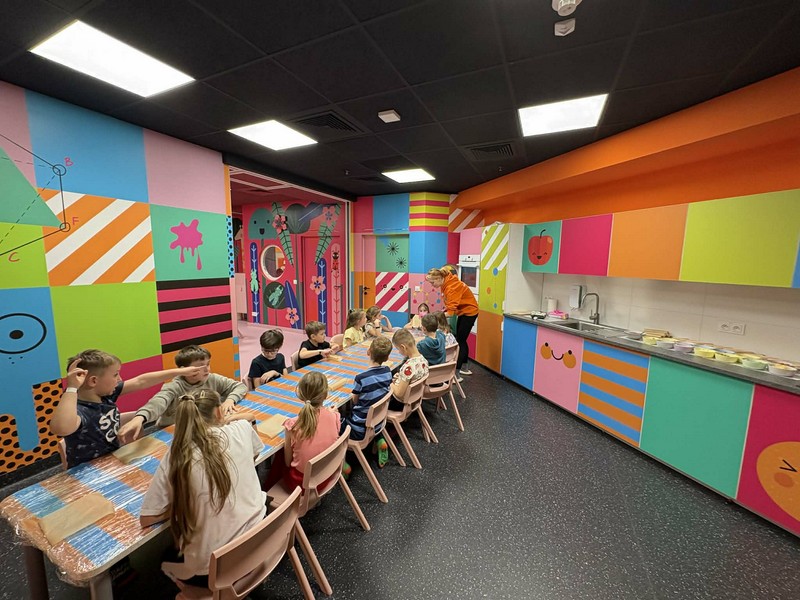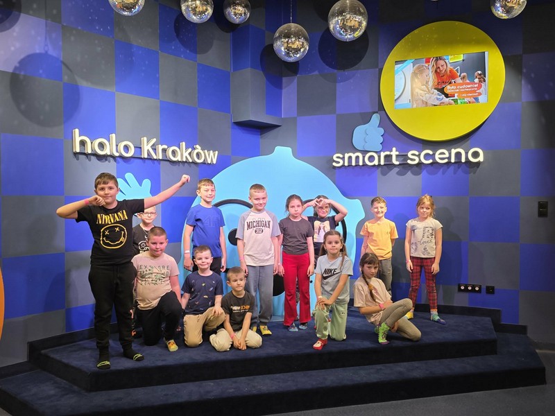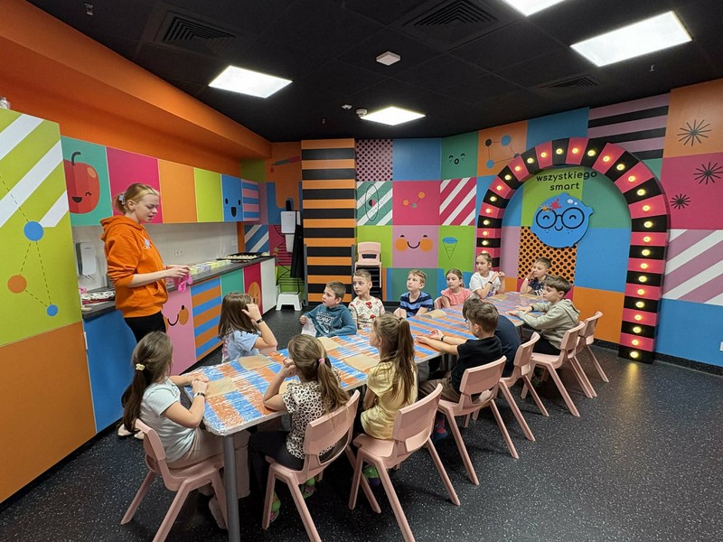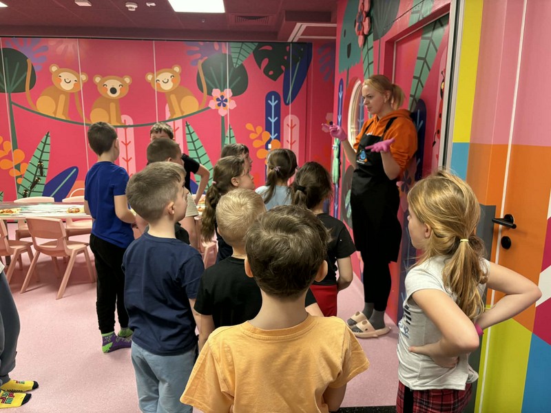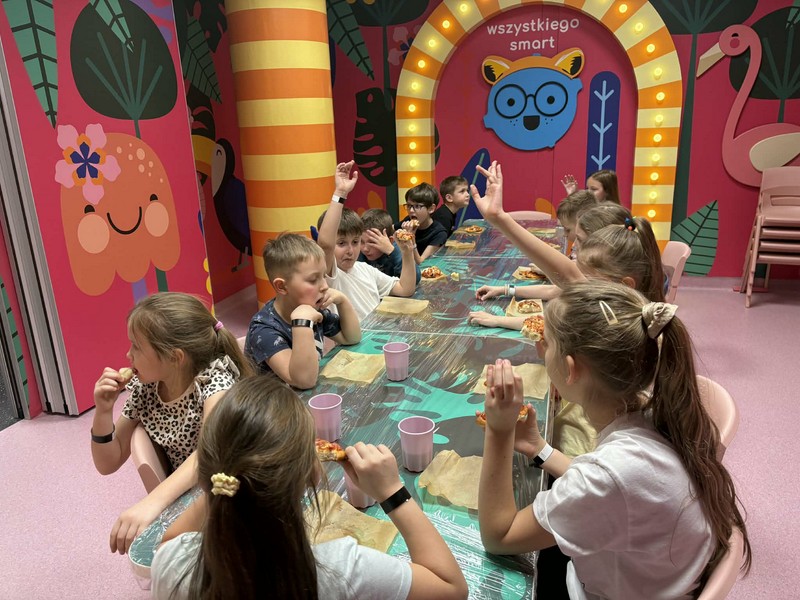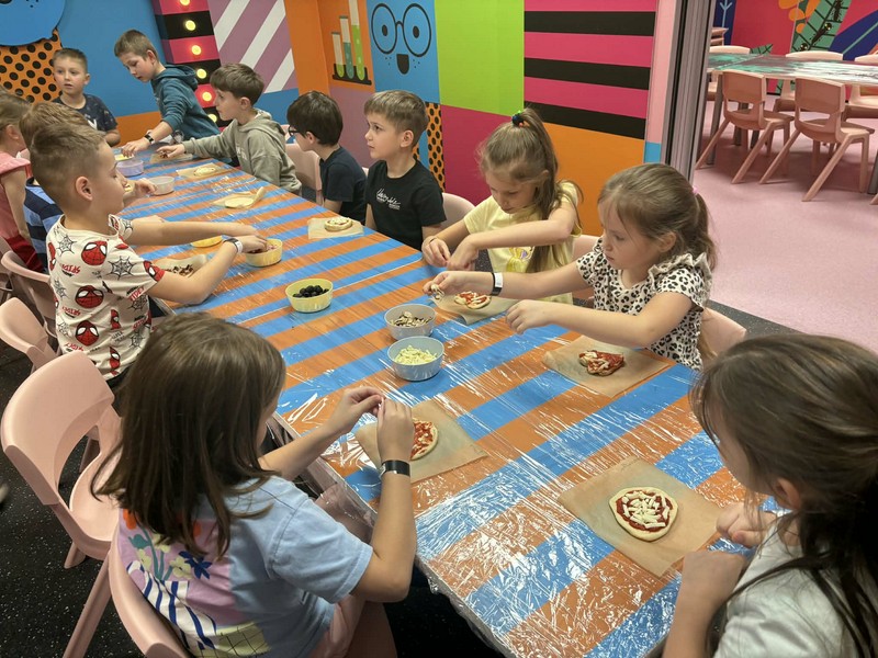 Po dawce kulturalnych emocji przyszedł czas na aktywną zabawę w Sali Smart. Dzieci miały okazję wyszaleć się w strefach zabaw, ale największą atrakcją okazały się warsztaty z robienia pizzy. Każdy uczeń zamienił się w małego kucharza – dzieci samodzielnie wyrabiały ciasto, dobierały ulubione składniki i z niecierpliwością czekały, aż ich dzieła wyjdą z pieca. Własnoręcznie przygotowana pizza smakowała najlepiej na świecie!