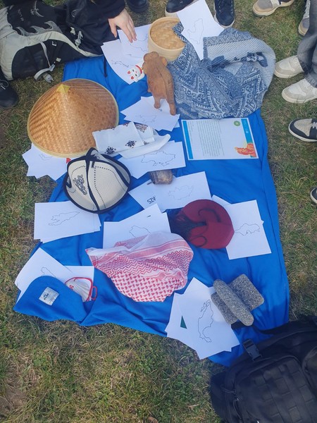 Na pierwszym punkcie mieliśmy spotkanie z podróżnikiem. Naszym zadaniem było przyporządkowanie do przedmiotów związanych z różnymi krajami nazwy kraju , mapy oraz kontury państwa.