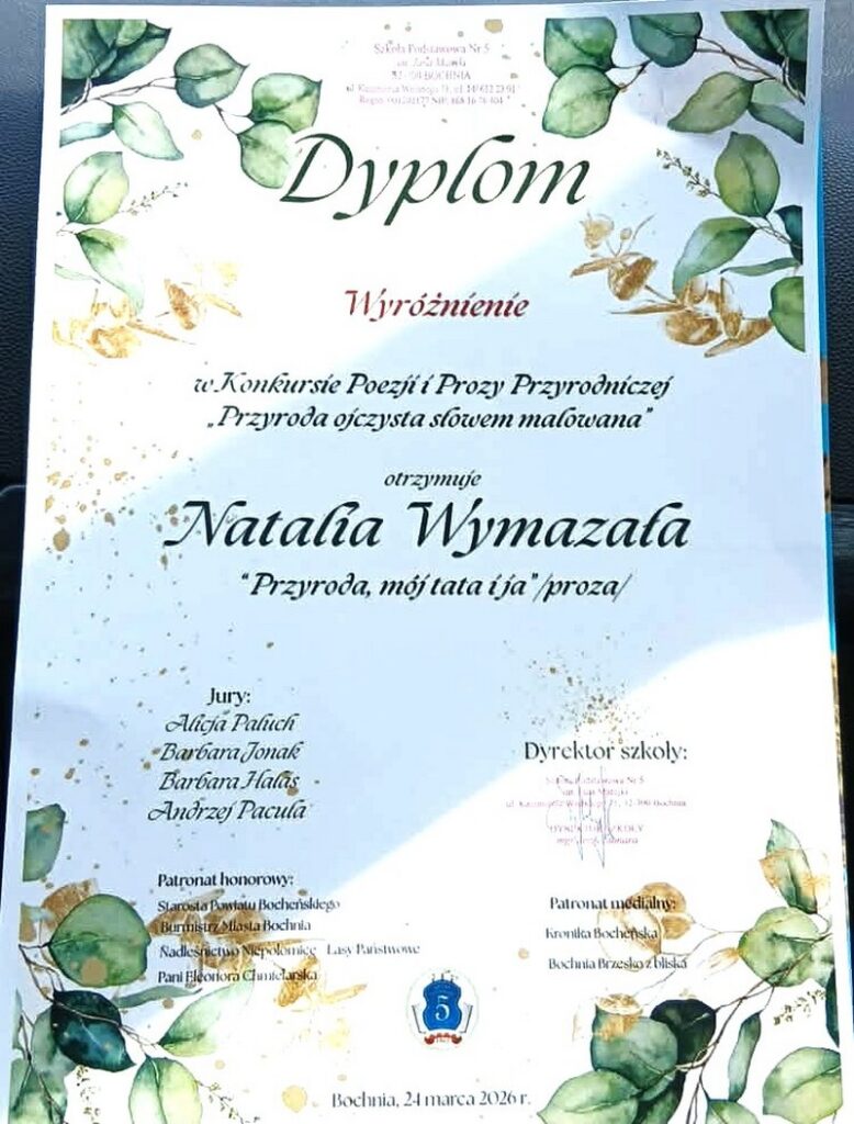 24 marca 2026 roku odbyło się rozstrzygnięcie Powiatowego Konkursu Poezji i Prozy Przyrodniczej pt. „Przyroda ojczysta słowem malowana”, zorganizowanego przez Szkołę Podstawową nr 5 im. Jana Matejki w Bochni.